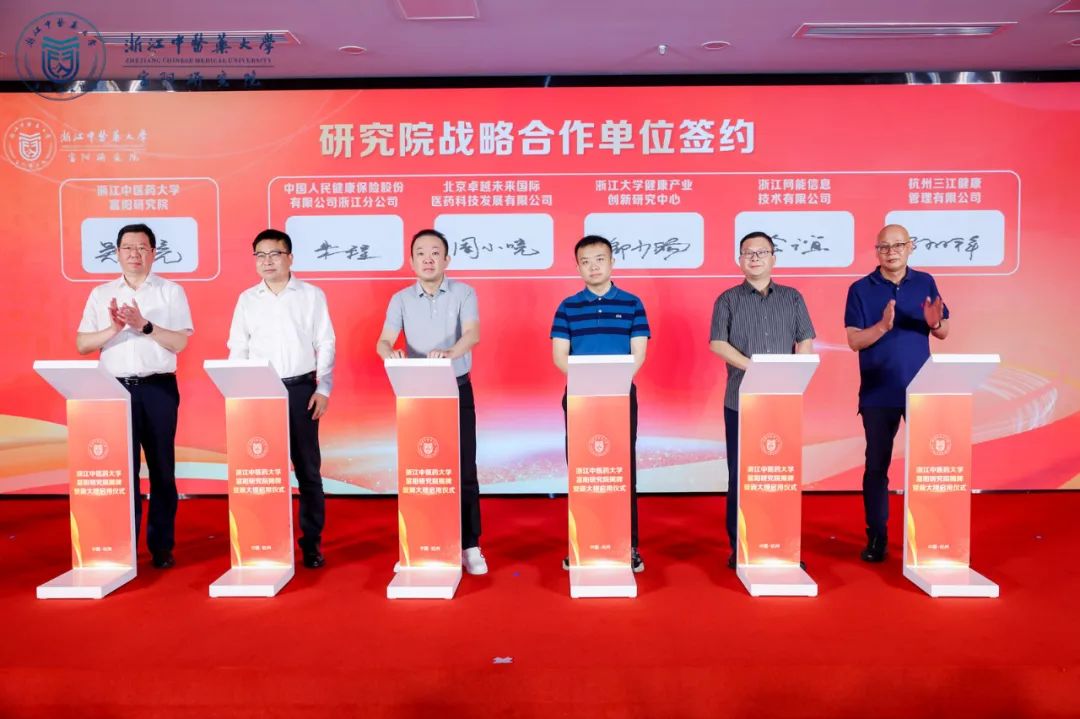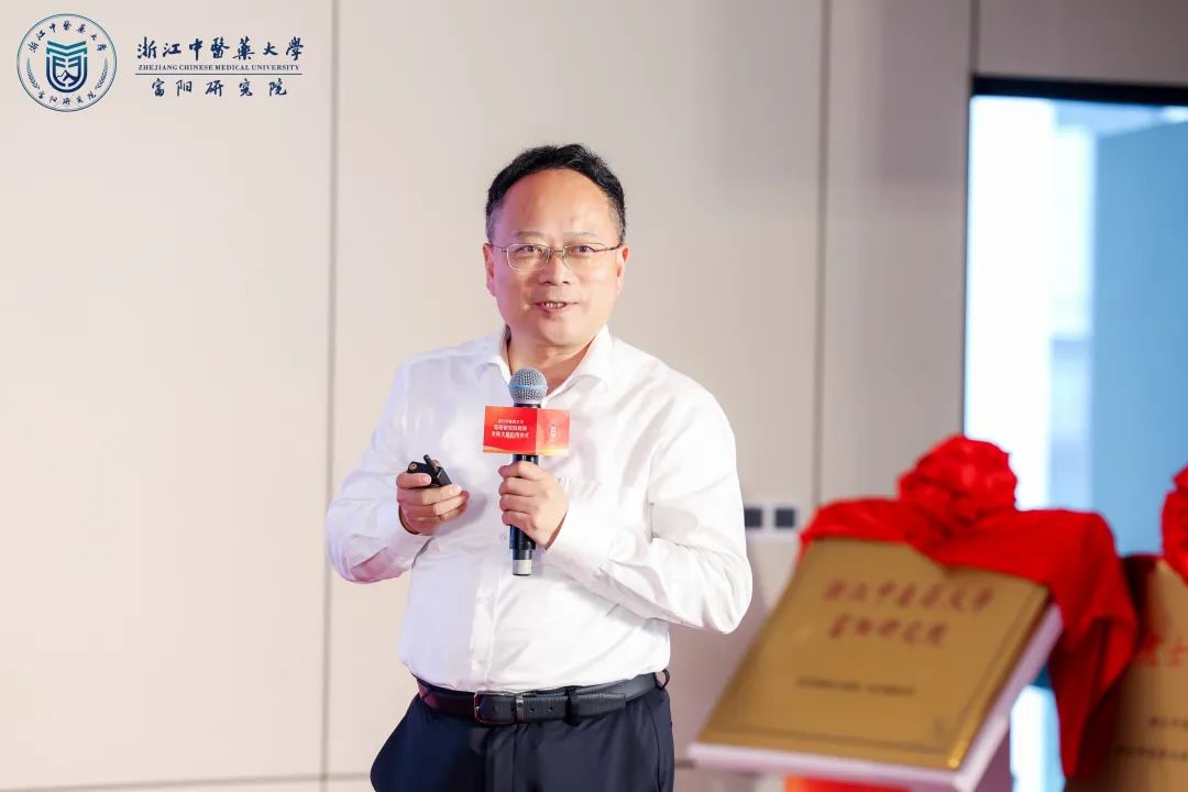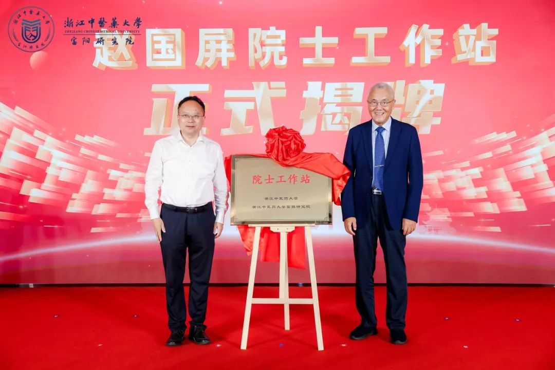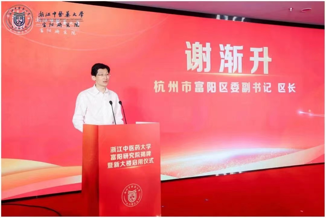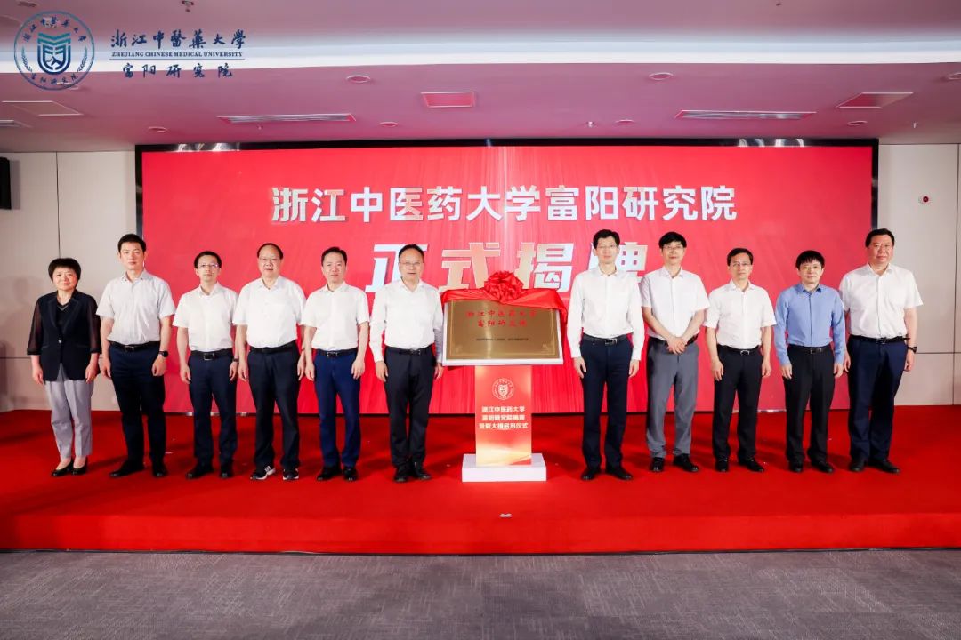 仪式现场,浙江中医药大学校长陈忠与富阳区委副书记、区长谢渐升共同为研究院揭牌。