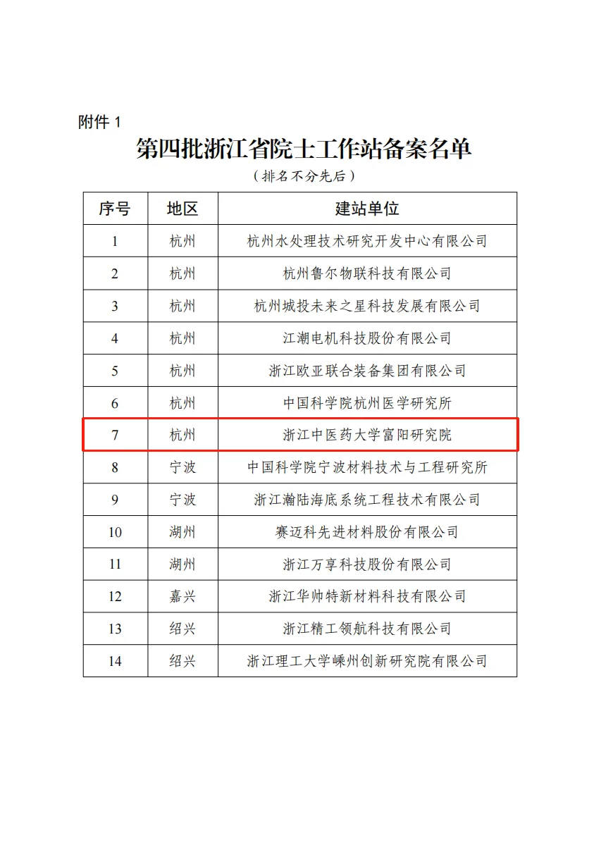 近日,浙江省院士专家工作站建设协调小组办公室公布了第四批共14家浙江省院士工作站备案通过名单(浙院协办〔2025〕3号),中科院赵国屏院士在浙江中医药大学富阳研究院设立的市级院士工作站升级成为省级院士工作站。