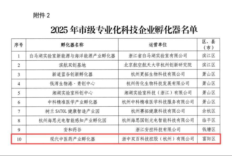近日,杭州市科学技术局公示2025年市级专业化科技企业孵化器名单,由研究院下属全资子公司——浙中双百科技控股(杭州)有限公司运营的“现代中医药产业孵化器”成功入选。