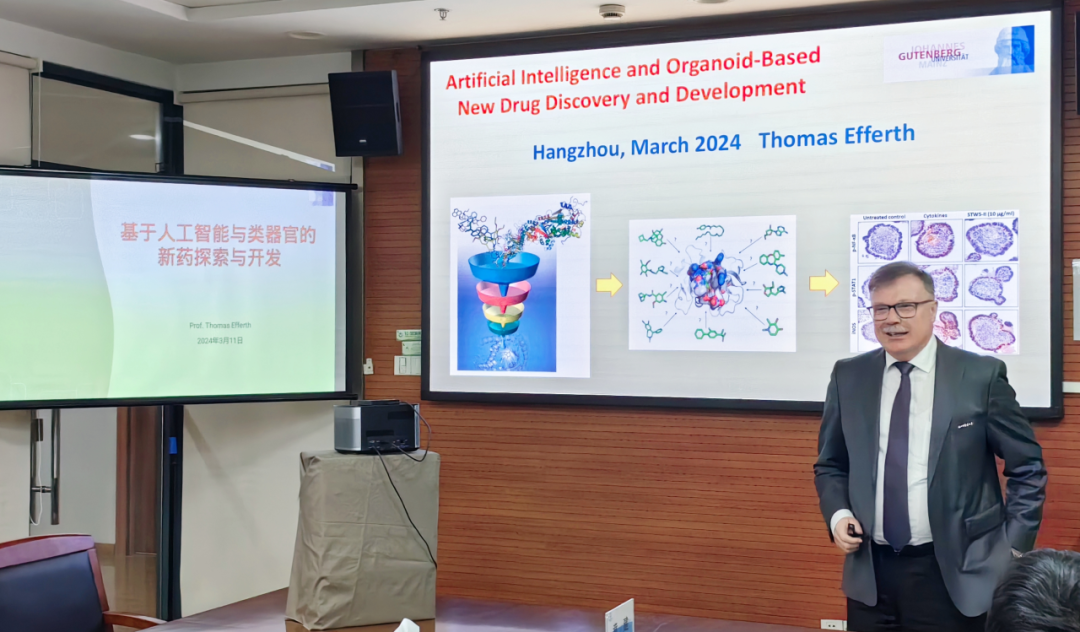 随后,Thomas Efferth院士做了题为“基于人工智能和类器官的中药新药研发”的主题报告,分享了近年取得的研究成果。参会专家、企业家代表分别与Thomas Efferth院士进行充分交流,对院士拟落地富阳的天然药物成分库、疑难疾病蛋白靶点库、类器官库等技术平台和候选药物项目产生了浓厚的兴趣,并期望未来开展深度合作。